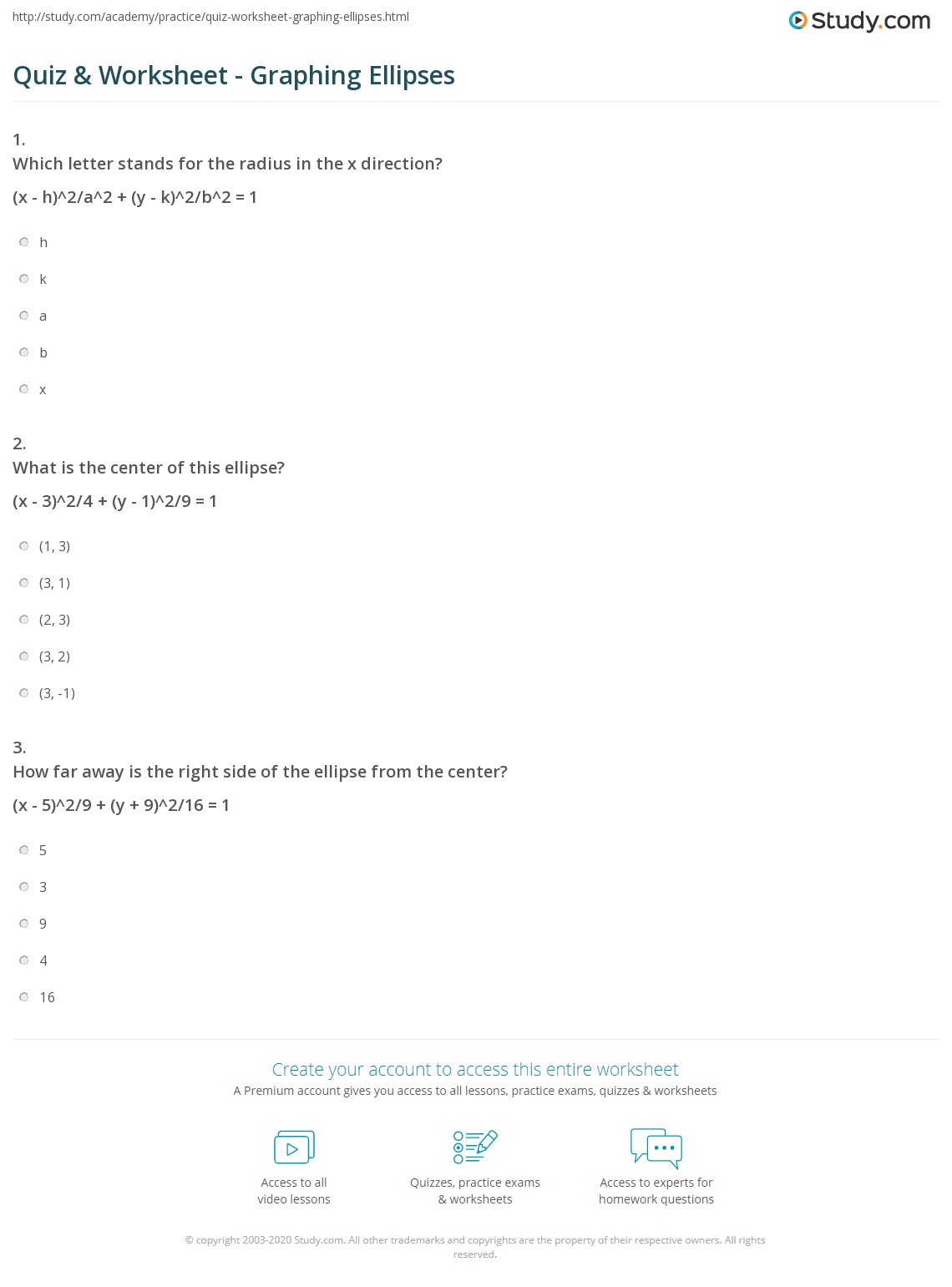 Graphing Ellipses Worksheet - Circles And Ellipses Worksheet For 11th Higher Ed Lesson Planet /. Create your own worksheets like this one with infinite algebra 2. Pch 8.3.1 ellipses at origin. Worksheet by kuta software llc. To graph an ellipse, you must first be able to identify the center point, whether it's horizontal or vertical, and the a and b values. Worksheet by kuta software llc.